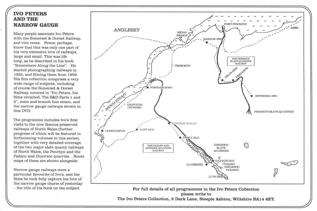 This volume takes Ivo Peter’s coverage of Britain’s railways into a new realm – the fascinating narrow gauge railways of North Wales. After a brief visit to BRs last narrow gauge line at Aberystwyth, we see the earliest days of the Talyllyn and Festiniog. Before the major part of the programme explores the long lost slate quarry railways – the Penrhyn and the Padarn and Dinorwic quarries. Each railway is covered in detail, with lineside trips up the lines and the slate quarries fully explored. Route maps shown on the inner DVD case sleeve. Originally released in 1988, the programme has been totally remastered. Some minor picture and sound editing has taken place to enhance this very popular programme.