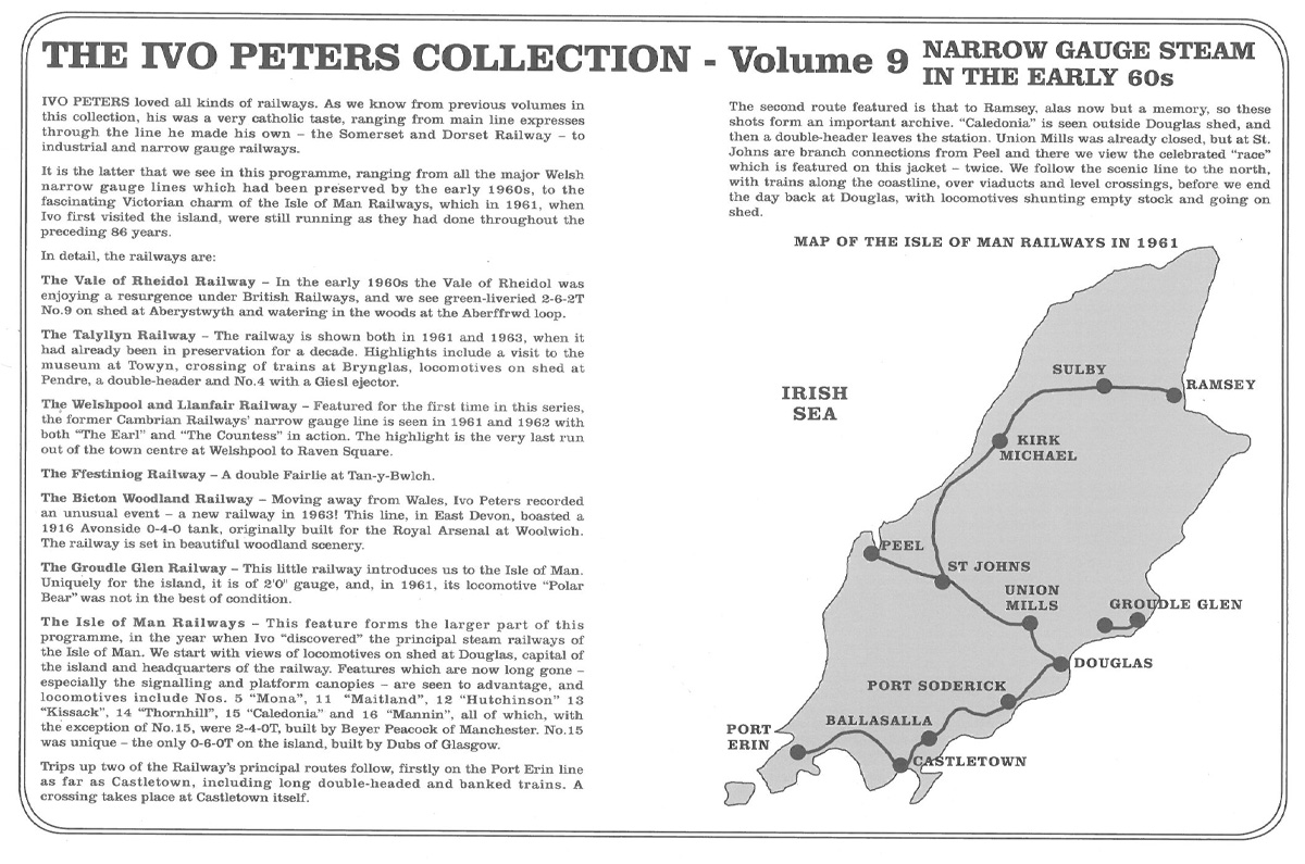 New railways were rare in the early 60s, so Ivo was attracted to the Bicton Woodland Railway in East Devon, where he filmed a 1916-built Avonside tank. The major feature of this programme recalls Ivo’s first visit, in 1961, to the Isle of Man, where he filmed both the Groudle Glen Railway and the main Isle of Man Railways, then still running to Port Erin, Peel and Ramsey from Douglas. There are comprehensive views of the locomotive depot and station at Douglas, together with film on each of the lines, including the famous “race” out of St Johns!