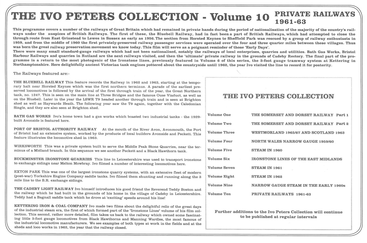 In this volume of his now-legendary film record of the railways of Great Britain in the 1960s, IVO PETERS turns his attention to a number of private railways which had either avoided nationalisation in 1948 or had been created after that momentous event.